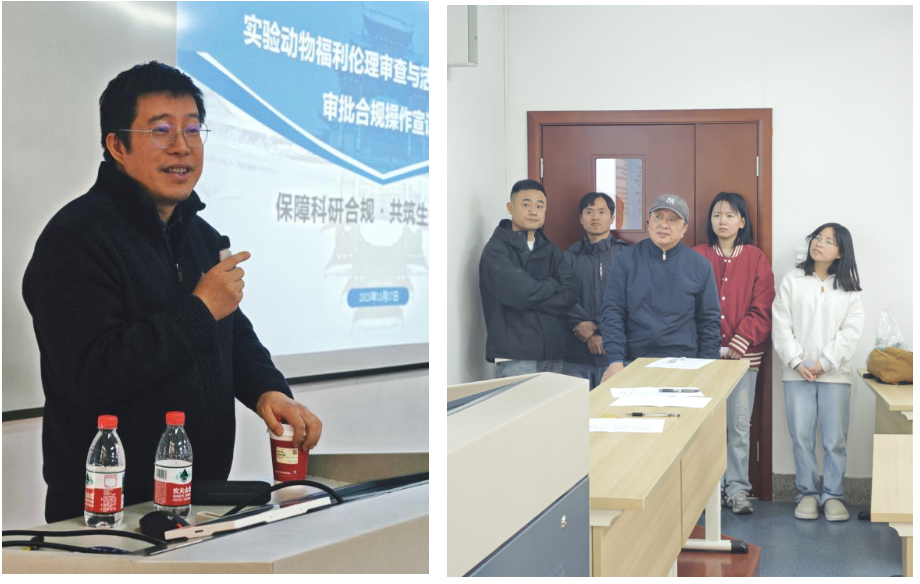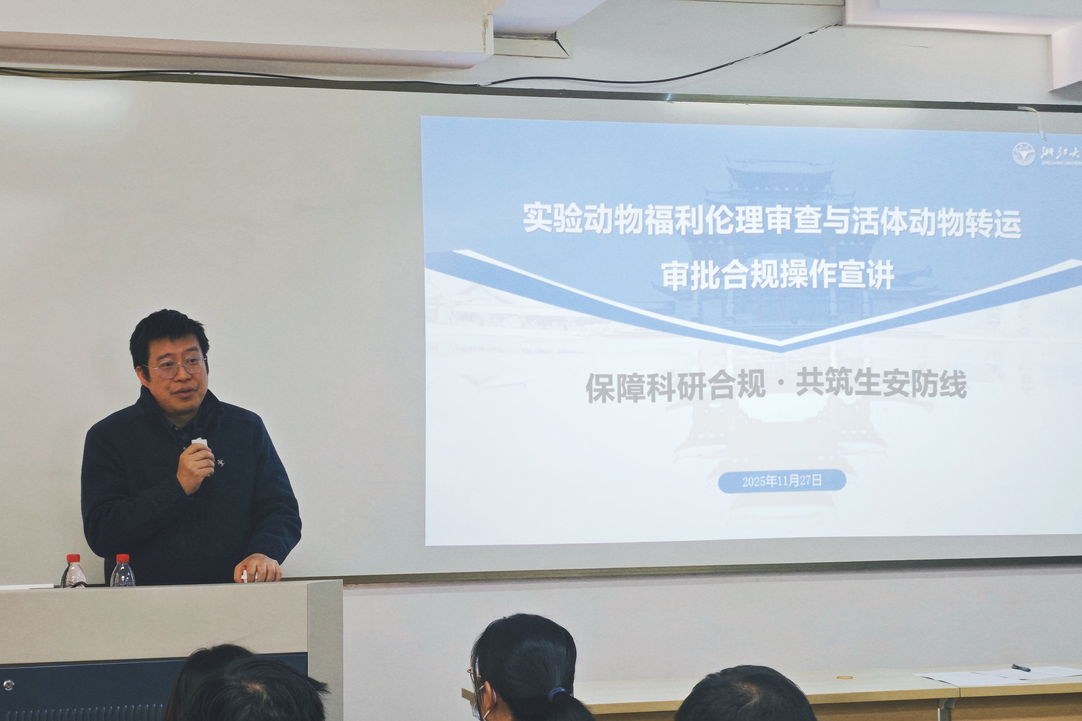 2025年11月27日中午,浙江大学实验动物福利伦理审查委员会联合实验动物中心在华家池校区举办专题宣讲会,宣讲会由华家池实验动物设施主管刘迪文老师主持,由浙江大学实验动物中心主任兼浙江大学实验动物福利伦理审查委员会主席汪洌教授、委员会秘书兼兽医陈若宁老师分别主讲,近70名转化医学院师生及附属医院科研人员参会,宣讲会以“政策+实操”双维度厘清实验动物伦理与转运合规要点。